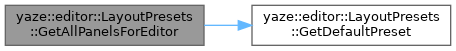 Referenced by yaze::editor::LayoutOrchestrator::ApplyPreset(), yaze::editor::LayoutManager::BuildLayoutFromPreset(), GetAllPanelsForEditor(), GetAllPresets(), GetDefaultPanels(), yaze::editor::LayoutOrchestrator::HideOptionalPanels(), and yaze::editor::LayoutCoordinator::ResetCurrentEditorLayout().