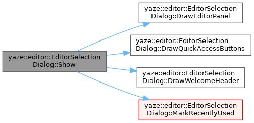 References DrawEditorPanel(), DrawQuickAccessButtons(), DrawWelcomeHeader(), editors_, ICON_MD_APPS, is_open_, MarkRecentlyUsed(), recent_editors_, selected_editor_, and selection_callback_.