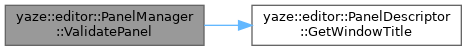 Referenced by ClearAllPanels(), GetAllCategories(), GetAllCategories(), GetAllPanelDescriptors(), GetPanelCount(), GetPanelDescriptor(), GetPanelsInCategory(), GetPrefixedPanelId(), GetVisibilityFlag(), GetVisiblePanelCount(), HideAllPanelsInCategory(), HideAllPanelsInSession(), HidePanel(), IsPanelVisible(), LoadPreset(), RegisterPanel(), SavePreset(), ShowAllPanelsInCategory(), ShowAllPanelsInSession(), ShowOnlyPanel(), ShowPanel(), TogglePanel(), UnregisterPanel(), UnregisterPanelsWithPrefix(), UnregisterSessionPanels(), ValidatePanel(), and ValidatePanels().